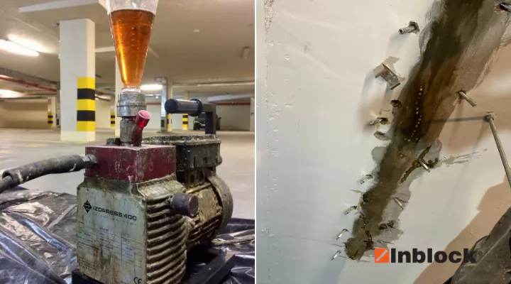 W celu uszczelnienia i wypełnienia rys i styków roboczych stropu obiektu wykonuje się naprawę w technologii iniekcji ciśnieniowej, zgodnie ze sztuką budowlaną, projektami wykonawczymi i doświadczeniem firmy Inblock sp. z o.o.