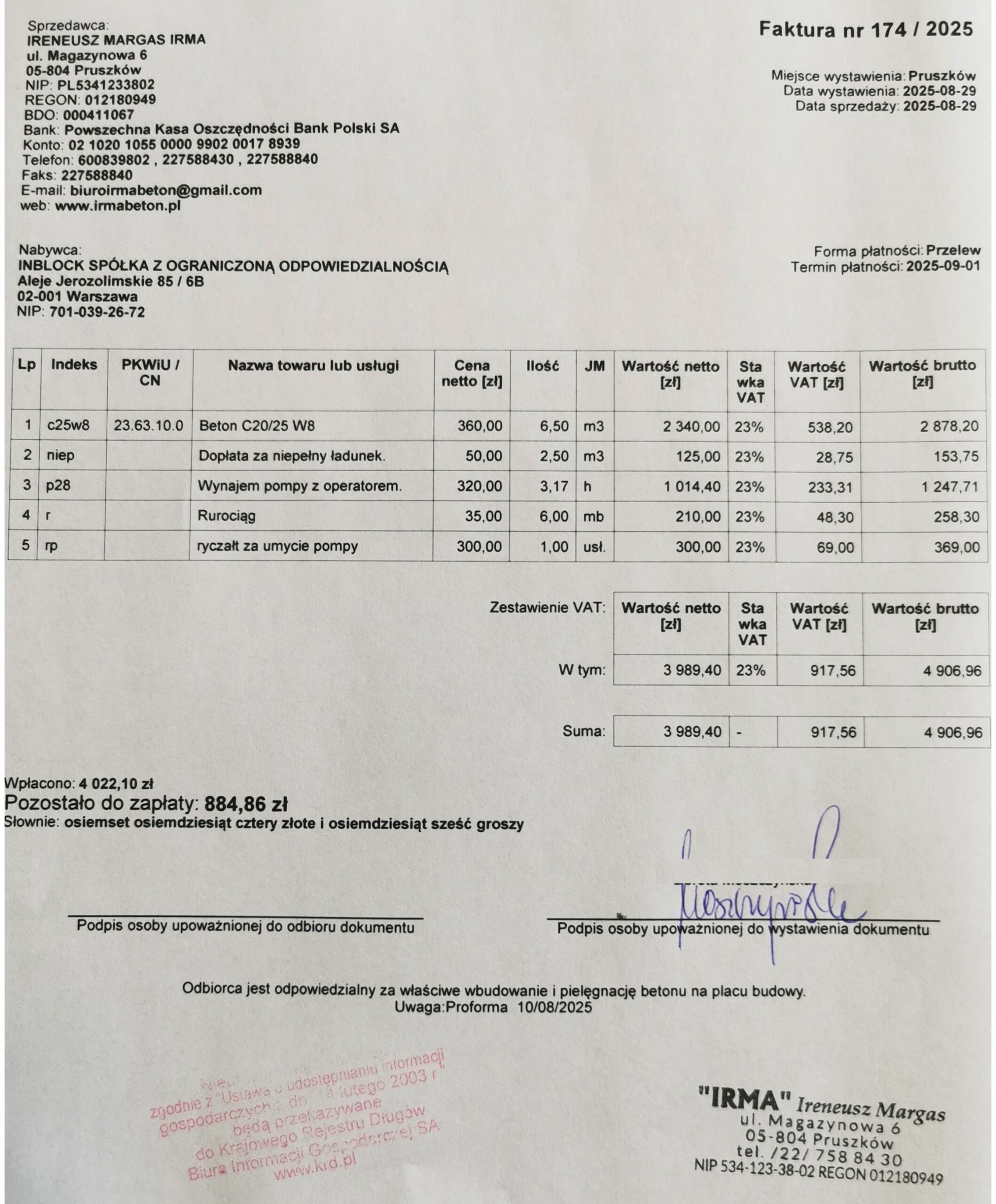 To skan naszej faktury, ale zachęcamy do użycia kalkulatora kosztu betonu, cena jednostkowa to nie koszt ostateczny…
